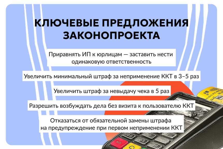 В текущем виде законопроект увеличивает минимальный штраф за неприменение ККТ для ИП в 15 раз — если не будет разницы между ними и юрлицами. Для юрлиц рост в 5 раз.
