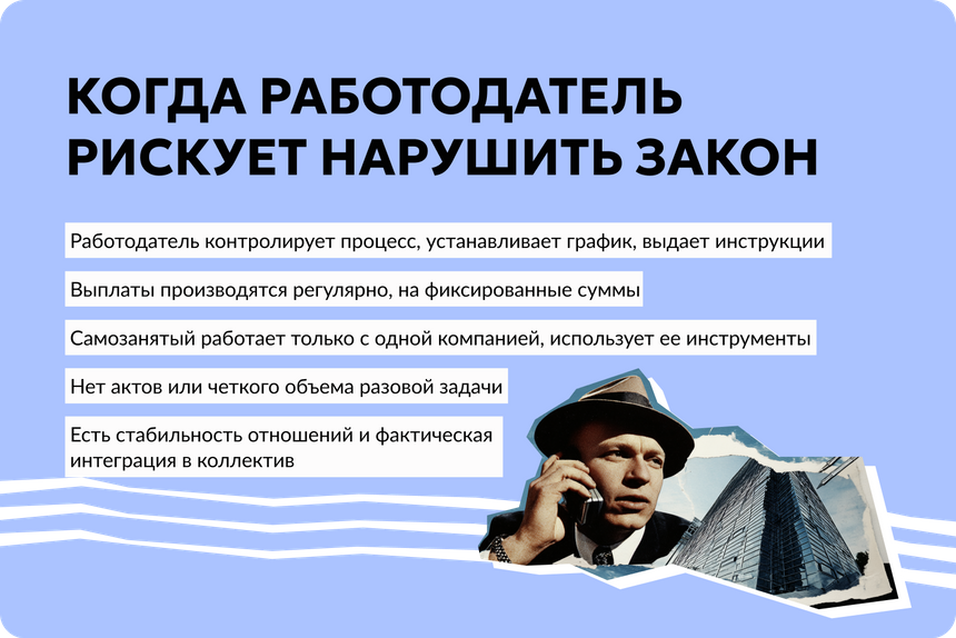 Один из главных рисков в работе бизнеса с самозанятыми — это создать трудовые отношения под видом гражданско-правовых. Если самозанятый практически превращается в вашего сотрудника, только в офис не приезжает и в штате не числится, договор с ним могут признать трудовым.