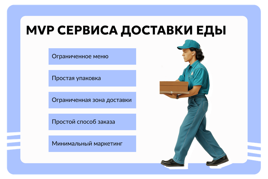 Например, вы владелец кафе в небольшом городе. И вы подумали: может, запустить доставку готовой еды? Вы не заказываете приложение, не разрабатываете дизайн упаковки и не нанимаете штат курьеров, а вместо этого делаете MVP сервиса доставки. Например, принимаете заказы по телефону или в соцсетях и лично развозите заказы на своей машине.
