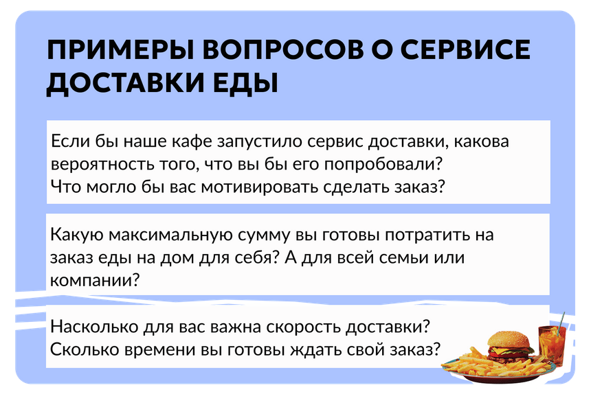 Результаты опроса даже нескольких десятков человек покажут, оправдывается ли гипотеза о том, что в вашем городе будет спрос на доставку готовой еды. А глубинные интервью или фокус-группы помогут найти новые гипотезы. Например, о том, что аудитории все-таки нужен новый продукт, но совсем другой.