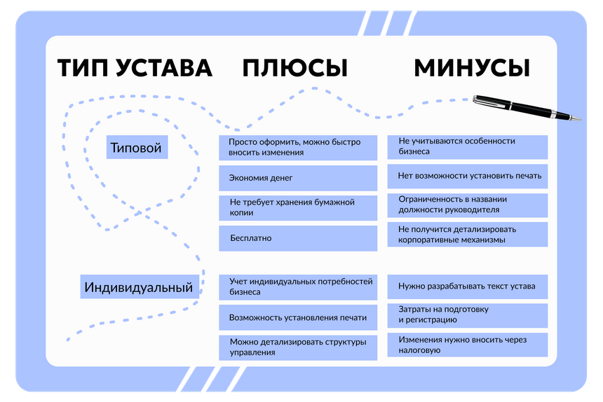 Типовой устав — это государственный шаблон, разработанный и утвержденный ФНС. Уже доступно более 30 вариантов таких уставов — различия между ними касаются структуры управления, сроков полномочий директора, порядка принятия решений и других базовых параметров.