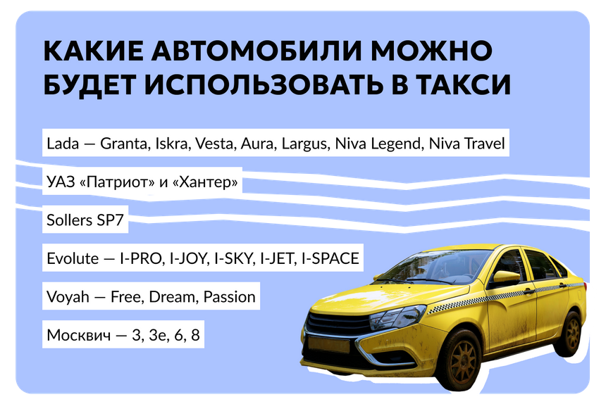 В октябре Минпромторг показал список моделей автомобилей, которые смогут работать в такси после вступления закона в силу.