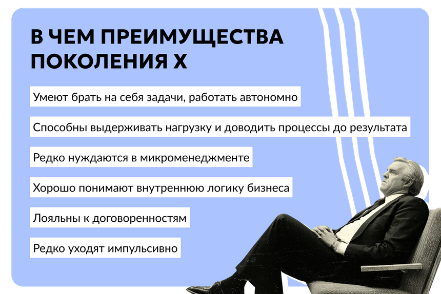 Список потребностей иксов велик, и мотивация зарабатывать огромна. Но она устроена иначе, чем у других поколений: иксам важны понятные правила, уважение к опыту и предсказуемость. Сотрудники из этого поколения становятся опорой команды — если с ними разговаривают как с партнерами, а не «ресурсом».