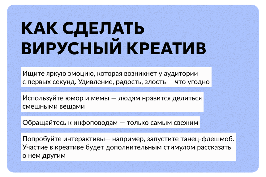 Вирусный контент требует креативного мышления и щепотки удачи. Иногда случайный креатив неожиданно разлетается по интернету, а тщательно продуманный не получает такого внимания. Ищите крючки, которые цепляют эмоции именно вашей аудитории.