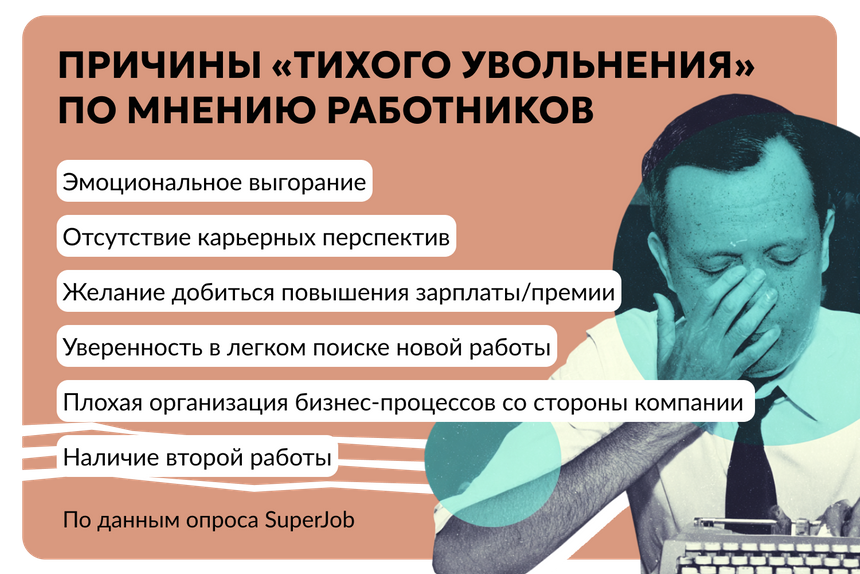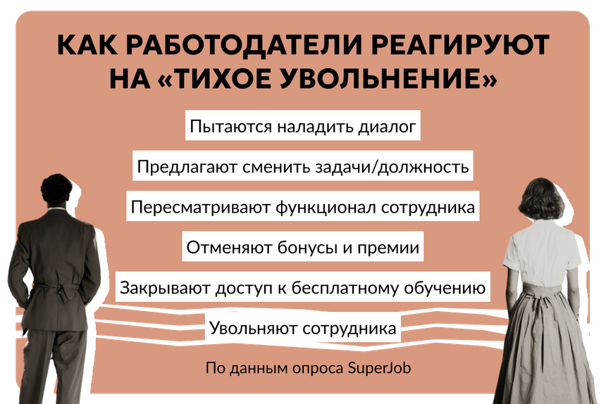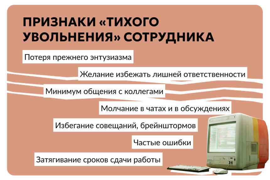 Такой подход не обнулит вероятность «тихого увольнения», но позволит снизить риски и контролировать ситуацию. «Тихое увольнение» — неприятная и даже опасная для бизнеса ситуация: он может начать терять деньги из-за падения продуктивности «потухшего» сотрудника. Если вы столкнулись с этим, важно понять причину происходящего и с холодной головой решить, стоит ли реанимировать работника или это только затянет ожидание перед реальным увольнением.