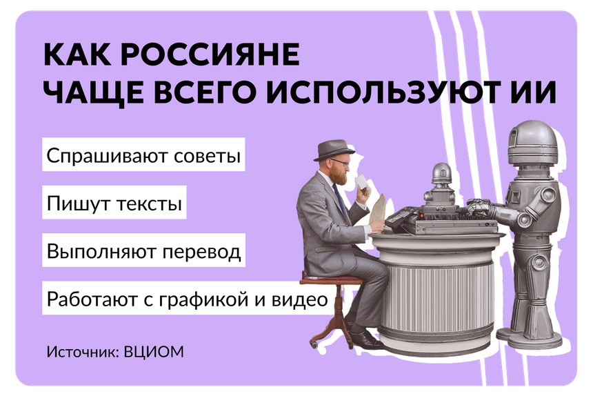 При этом 90% активных пользователей интернета в России следят за новостями об ИИ. Об этом говорит опрос ВЦИОМа. Семь из десяти уже пробовали работать с нейросетями. Половина обращается к ним минимум раз в неделю.