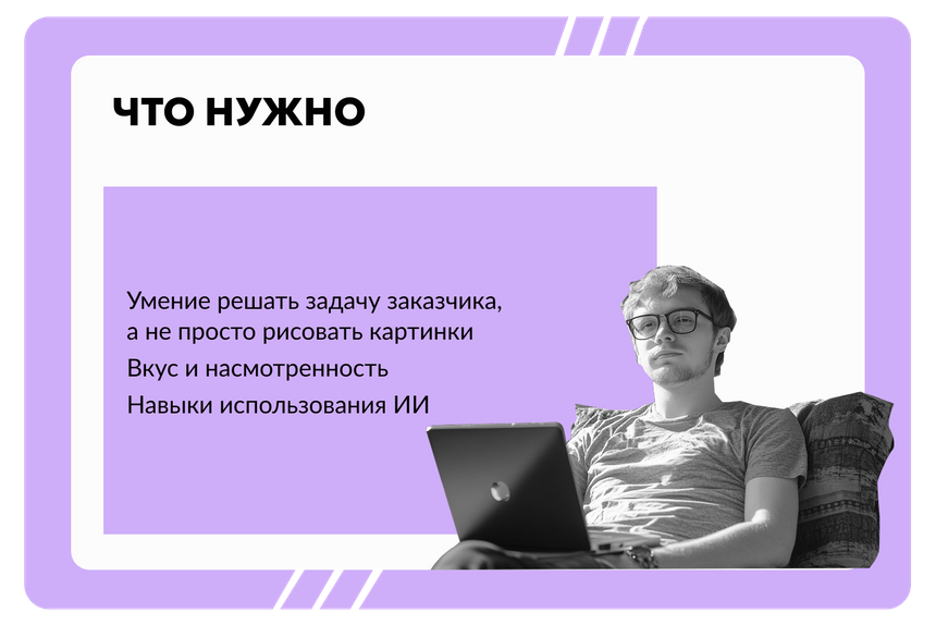 Навыки, которые помогут: исследование пользователей, концептуальное мышление, брендинг, умение работать с нейросетями (грамотно описывать запрос) и художественный вкус для финальной доработки.