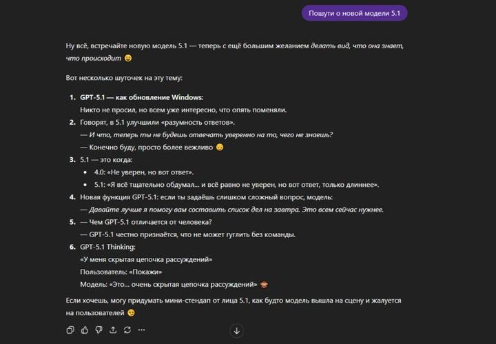 Поэтому всего через три месяца после выкатки пятой версии разработчики OpenAI представили версию 5.1, пообещав, что она будет «умнее и приятнее в общении».