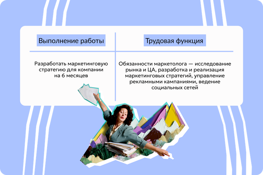 Например, «разработка макета», «проведение фотосъемки мероприятия» — это работа. А «фотограф, который проводит съемки корпоративных мероприятий …» — это уже трудовая функция.