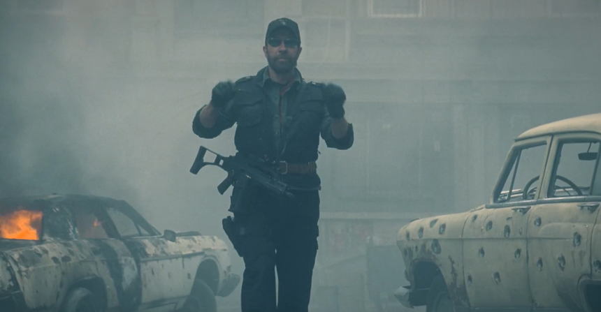 Последнее большое появление Норриса на экране, где он с иронией обыграл свой образ. Норрису тогда было уже за 70.