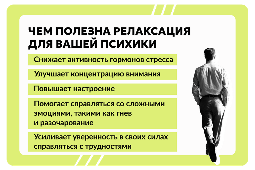 Важно подобрать техники расслабления, которые подходят именно вам, и методично их практиковать. Со временем вы научитесь погружаться в себя и свое тело.