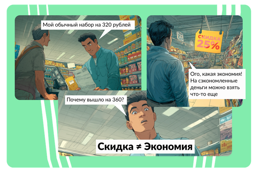 Скидка не всегда означает экономию. Часто она провоцирует потратить больше. Представьте: вы обычно покупаете консервы за 140 рублей и сыр за 180. Ваш чек — 320 рублей.