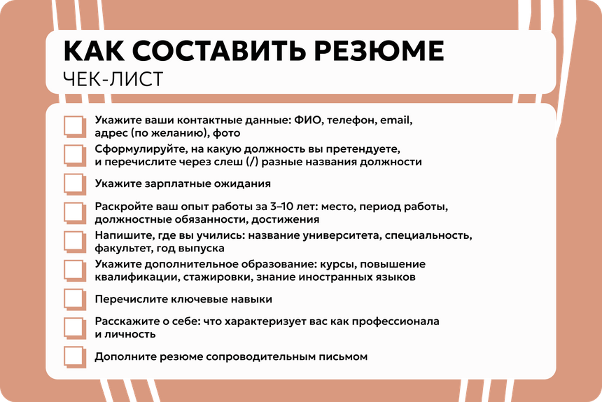 Резюме — это ваша визитная карточка. В нем вы кратко излагаете ваши навыки и опыт работы.