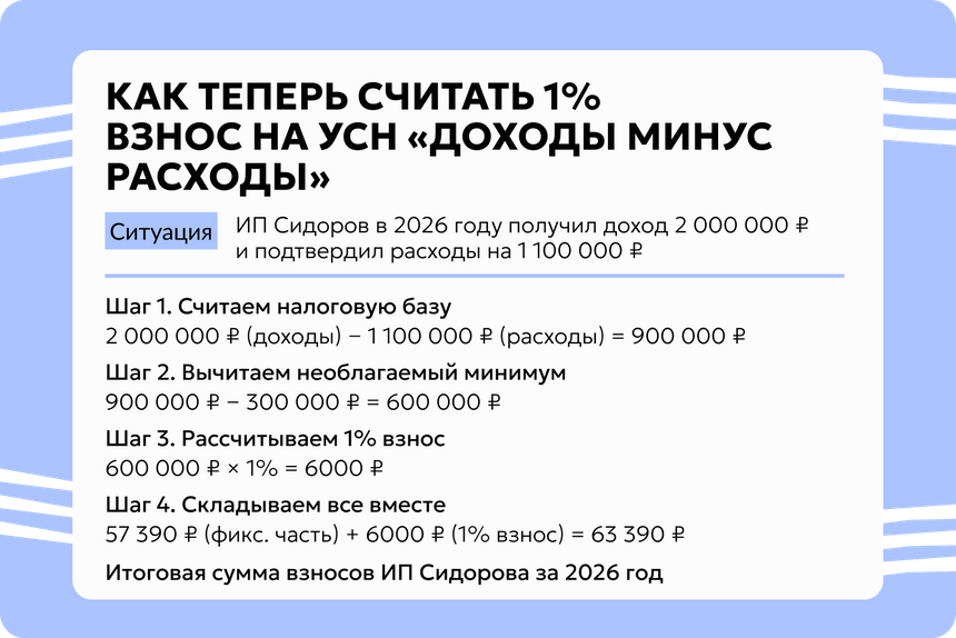 С 1 января 2026 года меняется порядок расчета дополнительного 1% взносов для ИП на УСН (доходы минус расходы) и ЕСХН. Теперь при определении базы для этого взноса предприниматели смогут вычитать расходы из доходов.