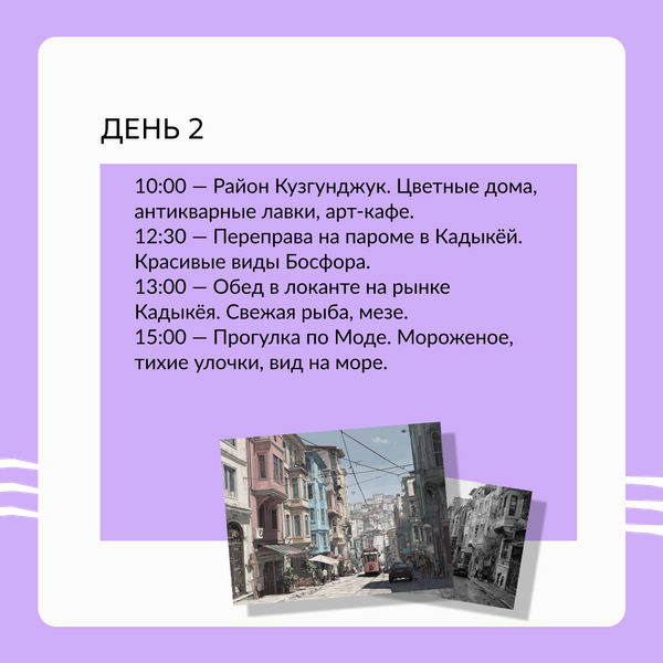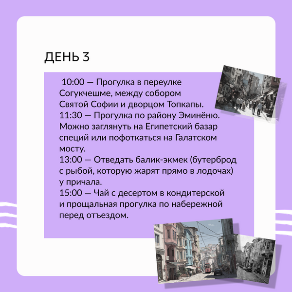 «Составь план отпуска на 3 дня [в Стамбуле с 1 по 3 ноября (лучше указать даты или хотя бы месяц и дни недели) для семьи с ребенком 10 лет, бюджет — 150 000 рублей. Интересует история города и еда. Не любим толпы».