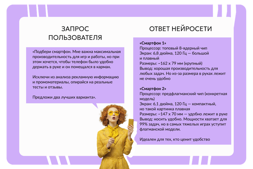 А еще логика ИИ не всегда бьется с реальностью. Например, вам говорят, что смартфон небольшой, его очень удобно держать в руках. Но в жизни компактные телефоны не всегда удобны. Многое зависит от размера ладони человека, от формы и материала корпуса. Для корректного вывода придется прописывать детали, поручать нейросети учитывать конкретные параметры.