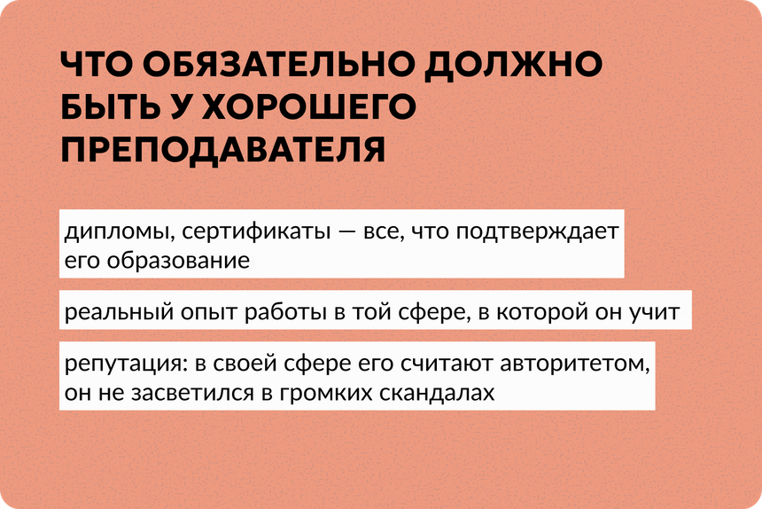 А еще у хороших преподавателей бывают пробные уроки (или часть курса доступна бесплатно). Если их нет или они слеплены на коленке (например, лектор выступает на фоне бабушкиного серванта) — это плохой знак.