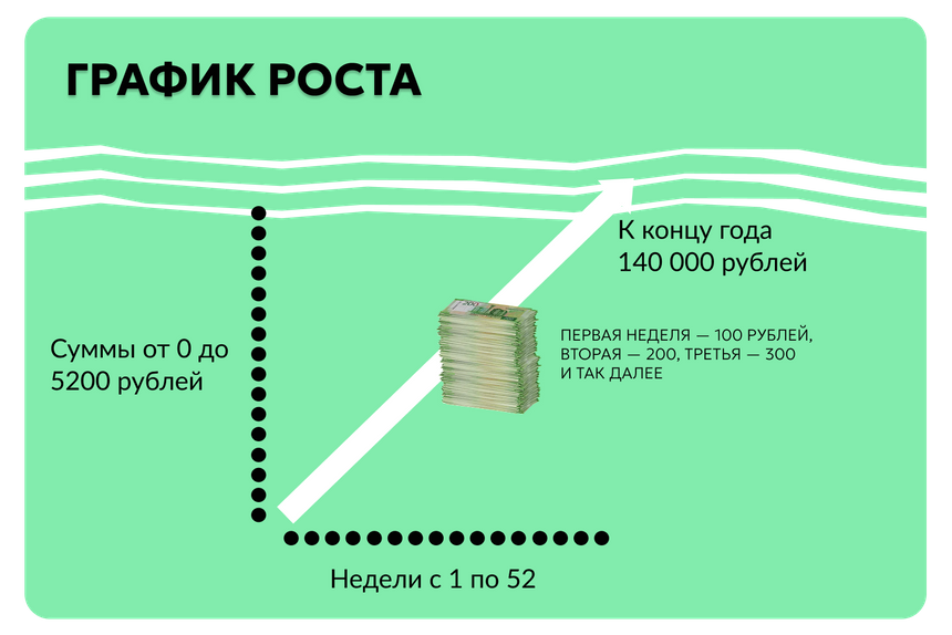 В конце, через 52 недели, если не нарушать правила игры, в вашей копилке будет 137 800 рублей, а последний взнос составит 5200 рублей.