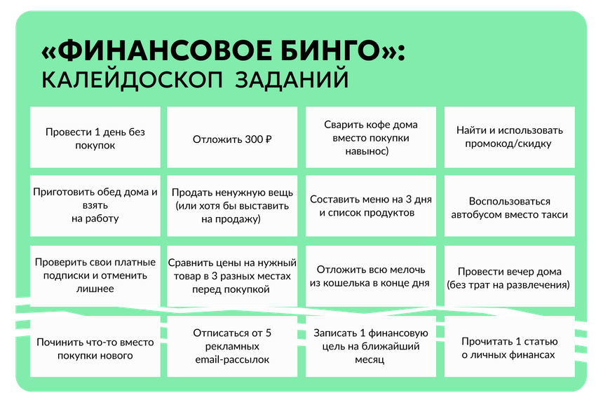 Нарисуйте или распечатайте квадрат с клетками 4x4 или 5x5. В каждую ячейку впишите не сумму, а небольшое финансовое задание: «провести день без трат», «отложить 500 рублей», «найти скидку и сэкономить», «приготовить обед дома вместо кафе».