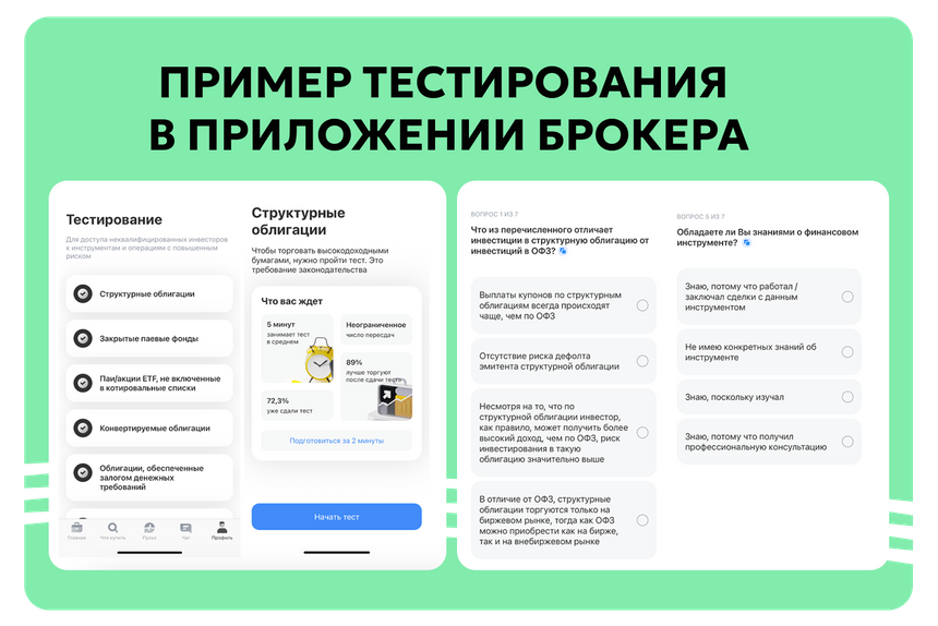 Пройти тест можно в приложении брокера. Там 7 вопросов типа: «Может ли инвестор по структурной облигации при погашении получить сумму меньше номинала?»