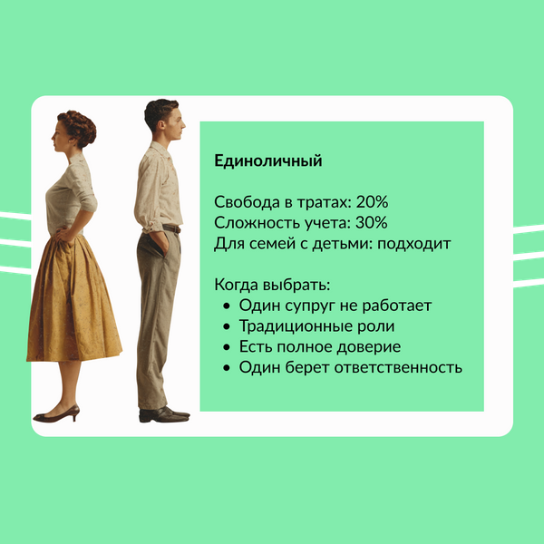 Кому подойдет: парам, где один из супругов готов полностью взять на себя финансовую ответственность, а второй готов с этим согласиться и не вмешиваться. Чаще всего модель встречается у семей с традиционным распределением ролей, где один супруг — «добытчик», а второй — «хранитель очага». В таких ситуациях важно, чтобы в семье было понимание и уважением функций каждого члена семьи, а не регулярные ссоры по вопросам выполнения обязанностей.