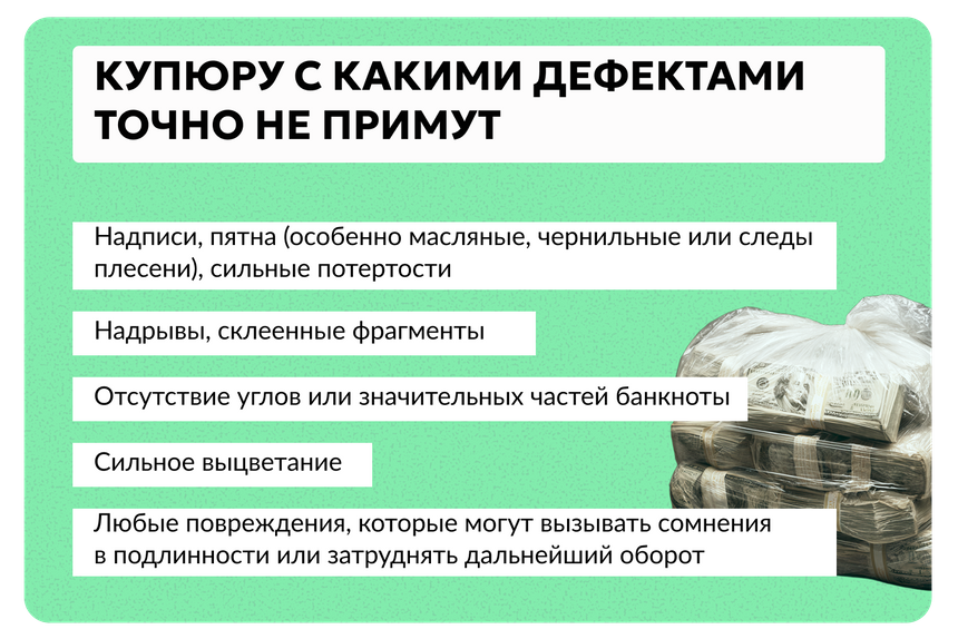 То если ваши доллары или евро — даже «беспроблемные» — имеют видимые дефекты, отказ будет правомерен.