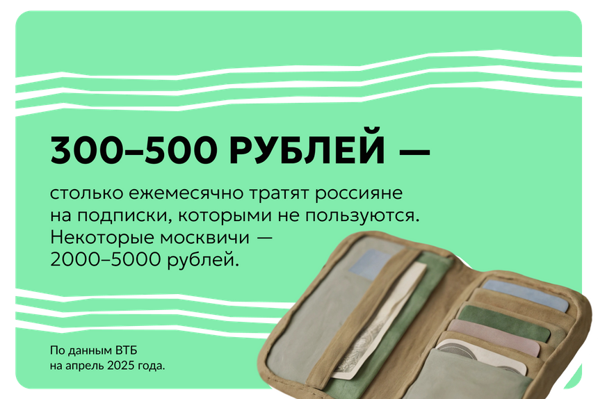 300–500 рублей — столько ежемесячно тратят россияне на подписки, которыми не пользуются. Некоторые москвичи — 2000–5000 рублей (по данным ВТБ).