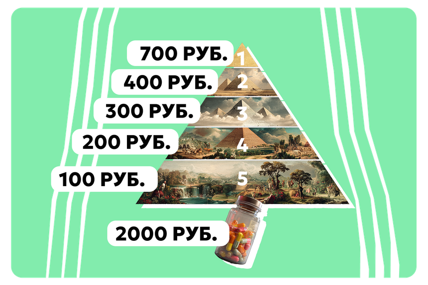 Например: себестоимость банки витаминов — 200 рублей. В розничном магазине ее продали бы за 600 рублей (накрутка 400 рублей — это прибыль магазина, логистика и т. д.). У сетевиков банка будет стоить уже 2000 рублей.