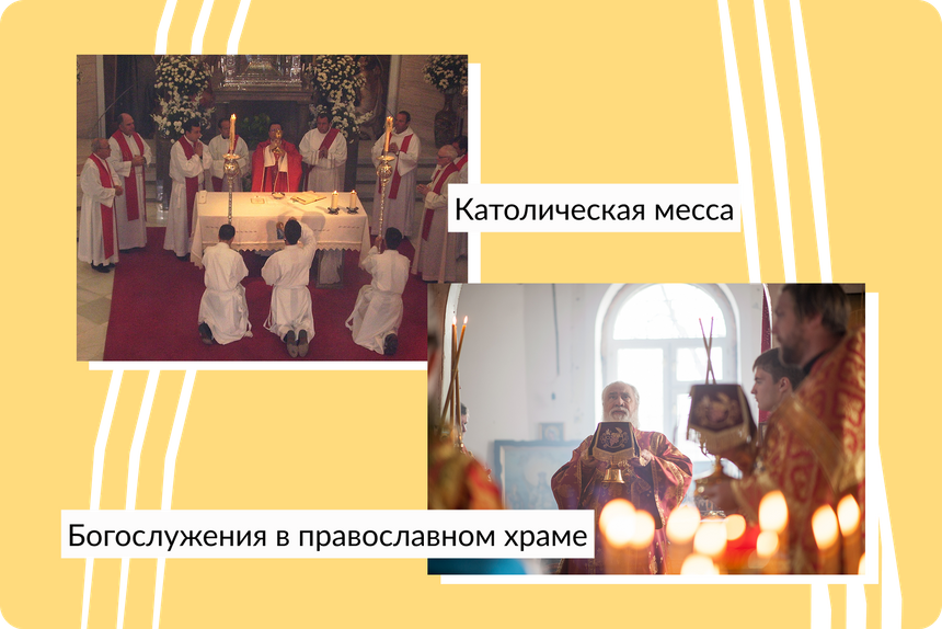 Традиции. В католических храмах есть скамьи для прихожан, в православных принято стоять, хотя лавки для тех, кто не может, тоже есть. Для причастия католики используют пресный хлеб, а православные — квасной.