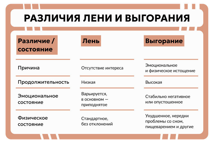 Лень и выгорание важно различать еще и потому, что с первой можно справиться самому и с наскока. Со вторым придется разбираться комплексно и, возможно, с помощью психологов и коллег.