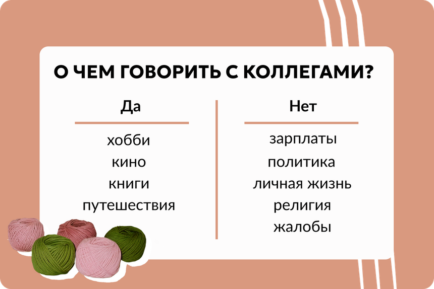 Лучший способ наладить отношения — качественно выполнять свои задачи и быть готовым помочь коллегам в рабочих вопросах. А лучшие темы для офисной неформальной беседы — хобби, кино, книги, путешествия, современные технологии. Как не надо: «Ой, вы не представляете, каким идиотом был мой бывший начальник! Зарплату задерживал постоянно. А нас ведь ипотека душит, просто не знаю, что делать…» Лучше: «На выходных наконец посмотрел «Дюну». Так и не понял хайпа. Кто-то может объяснить его?»