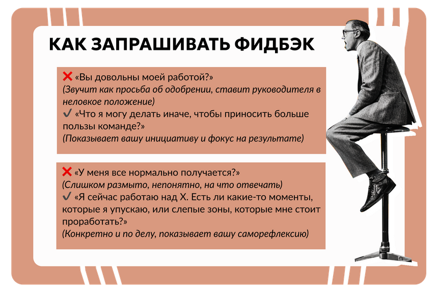 Но не стоит подбегать к начальнику с вопросом «Ну как я?» в коридоре или после напряженного совещания. Для этого есть более подходящее время. Например, во время плановой встречи 1 на 1, после завершения крупной задачи или перед началом новой.