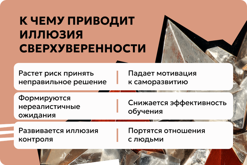 Итог: иллюзия сверхуверенности в разной степени присуща многим людям и не плоха сама по себе. Высокая самооценка и вера в себя дают дополнительную мотивацию и психологическую поддержку двигаться вперед. Но если она отрывает человека от реальности, формирует ощущение исключительности, идеальности и всемогущества — это потенциальный шаг от провала в бизнесе, в карьере и в обычной жизни. Чтобы не рухнуть, нужно развивать критическое мышление и заниматься самоанализом.