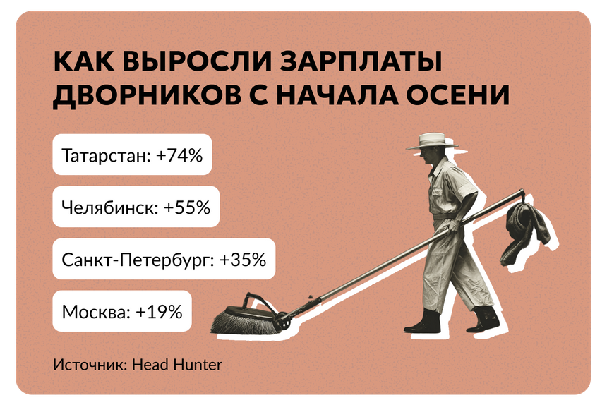 По данным Head Hunter, средняя зарплата дворников в России выросла на 38% за год и достигла 42,3 тыс. рублей.