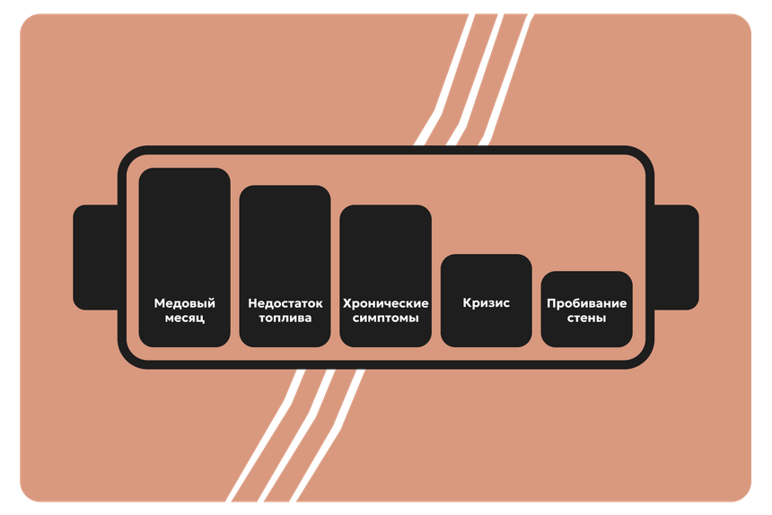 «Кризис». Развиваются хронические болезни, которые уже напрямую мешают работе. Выполнить удается только минимальный набор задач, а сама работа вызывает апатию, раздражение или даже ненависть. Коллектив начинает бесить. Жизнь кажется никчемной.