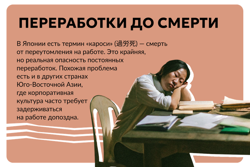 Многие работают гораздо больше стандартных 40 часов в неделю. По данным Международной организации труда, треть работников в мире регулярно трудится более 48 часов в неделю.
