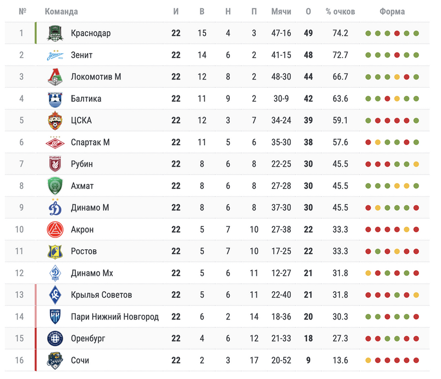 По итогам 22-го тура «Краснодар» продолжает лидировать в РПЛ. «Зенит» все так же отстает лишь на одно очко. До конца чемпионата осталось восемь туров, сейчас команды уходят на международный перерыв до 4 апреля.