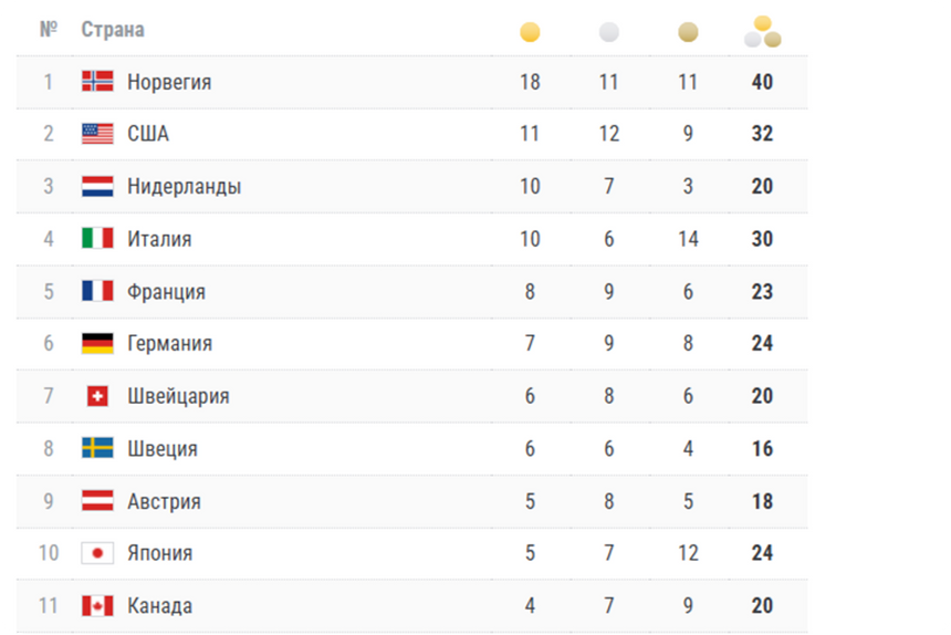 Перед финальным днём Олимпиады норвежцы лидируют с 40 медалями, из которых 18 золотые. Италия потеряла место в тройке, пропустив вперёд Нидерланды и США. Последний день Игр решит, кто же из сборных сильнее!