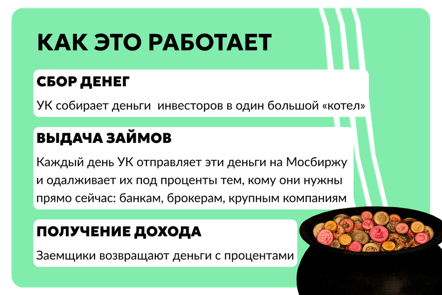 Напрямую одолжить деньги заводу или банку на один день вы не сможете — это игра для крупных участников. Зато вы можете объединиться с тысячами других инвесторов и сделать это вместе. Именно так и работают фонды денежного рынка.